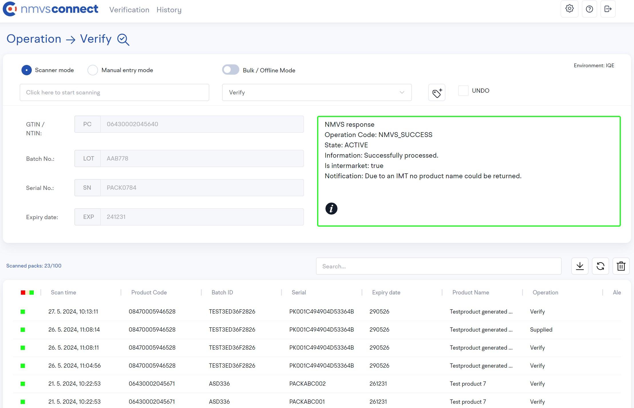 The application allows users to verify Unique Identifiers (Datamatrix barcodes) in medicinal packages using a barcode scanner or mobile device camera. Scanned data is verified within the European Medicines Verification System. The application includes a full set of features, enabling users to be fully compliant with FMD rewuirements (EU Delegated Regulation 2016/161).