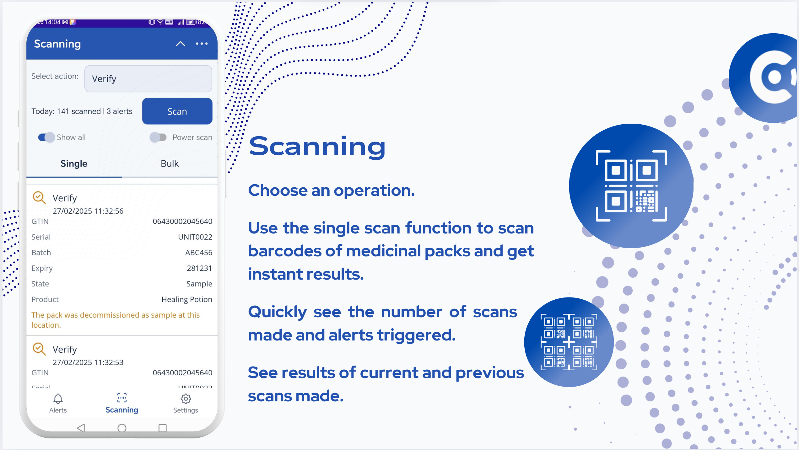 The application allows users to verify Unique Identifiers (Datamatrix barcodes) in medicinal packages using a mobile device camera. Scanned data is verified within the European Medicines Verification System. The application includes a full set of features, enabling users to be fully compliant with FMD requirements (EU Delegated Regulation 2016/161).