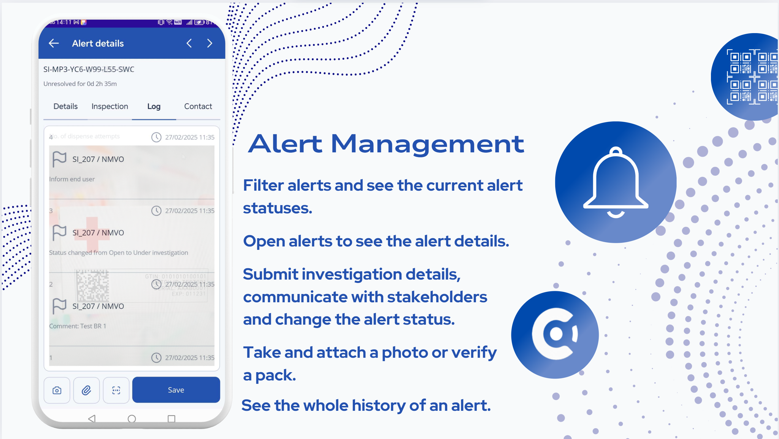 Integration with NMVS Alerts allows users to quickly resolve alerts, instatly upload pack photo for MAH investigation, or even re-scan datamatrix.